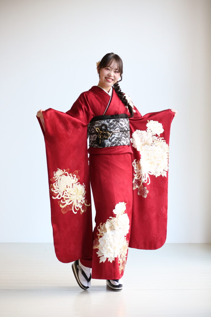 ボルドー色に大きな菊の柄が印象的な一着。