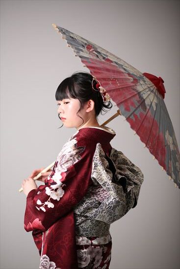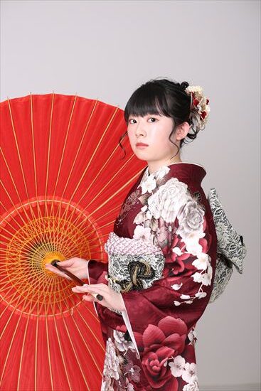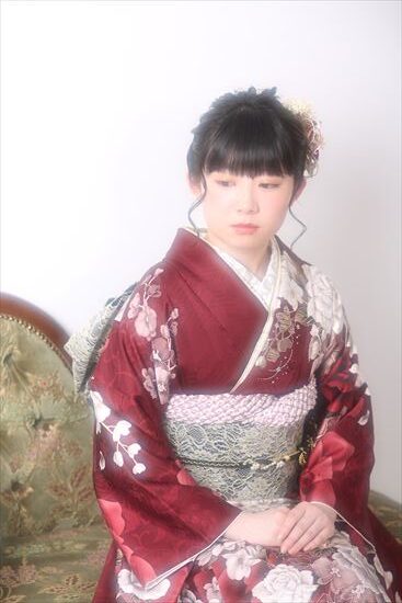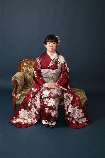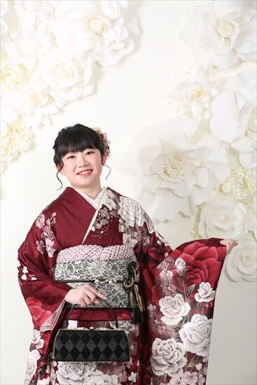深紅地の落ち着いたお振袖をお召になられたお嬢様